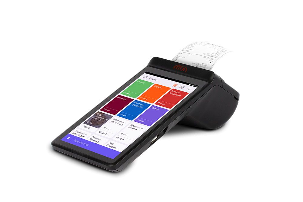 Имеет встроенный аккумулятор, передает данные с помощью Wi-Fi и SIM-карты. Можно одновременно подключить сканер, весы, пинпад и денежный ящик.